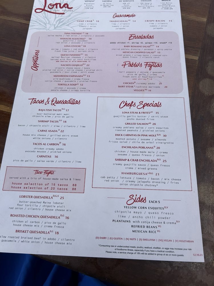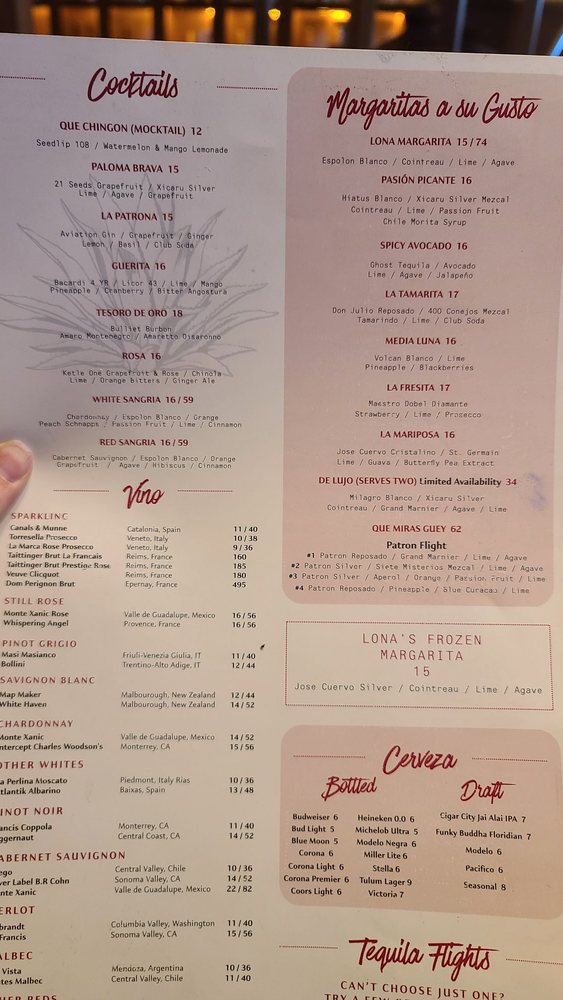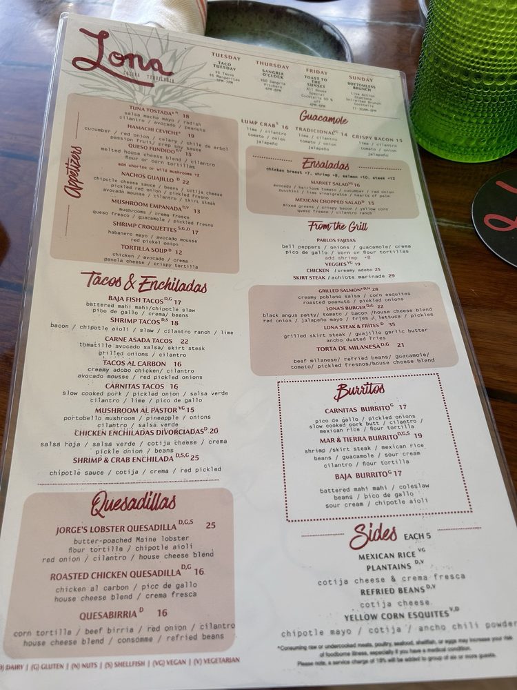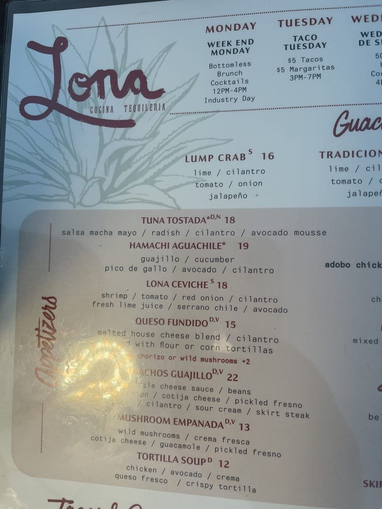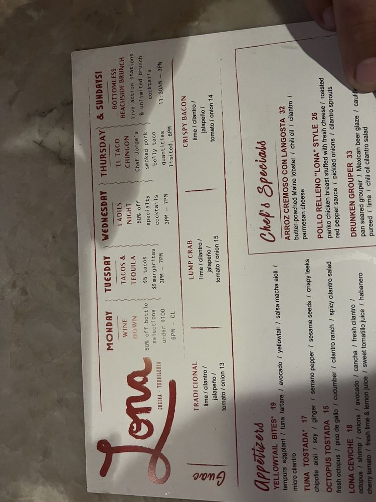 Introducing the menu at Lona Cocina Tequileria, a Mexican and seafood venue in Fort Lauderdale Beach, is a delightful experience. With a wide range of options including lump crab guac, tuna tostada, shrimp croquettes, and queso fundido, there's something for every palate. The special dishes like carnitas tacos and lobster quesadillas receive high praise from customers, along with the refreshing Rosa cocktail. The ambiance of the restaurant, overlooking the beach, adds to the overall dining experience. The attentive service from staff and delicious food make Lona Cocina Tequileria a must-visit spot for both locals and tourists. Enjoy a meal here for a taste of authentic Mexican flavors in a trendy and classy setting.